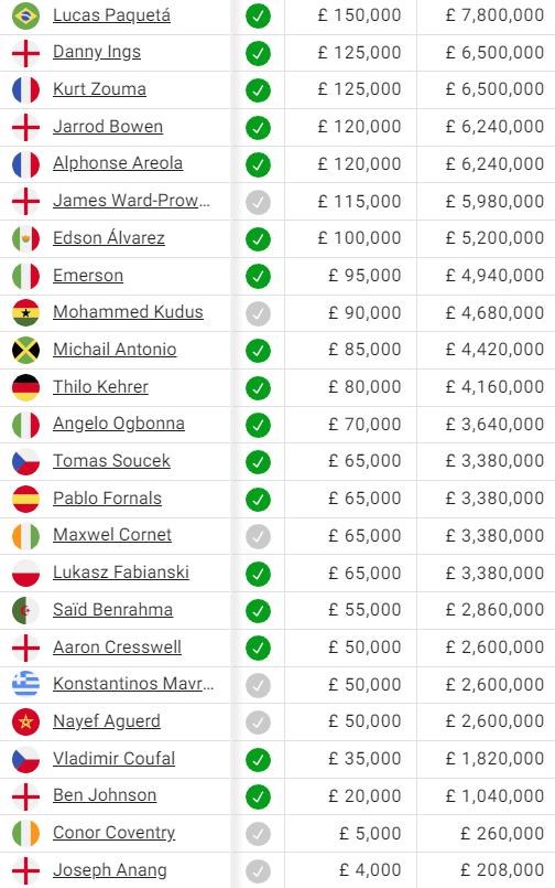 V rebríčku kladivárov je najvyššie Brazílčan Paqueta, o ktorého sa v lete zaujímalo majstrovské City. O niečo nižšie nájdeme aktuálne nie príliš produktívneho útočníka Ingsa, obrancu Zoumu, záložníka Bowena (ktorý podpísal novú sedemročnú zmluvu iba pred pár dňami) a gólmana Areolu.