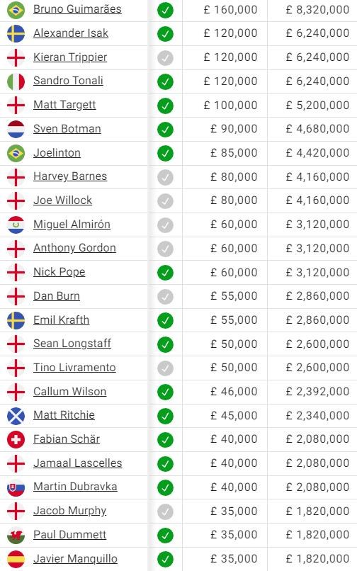 Nedávno podpísaná nová zmluva s Brunom Guimaraesom je jednoznačne najvyššia a presiahla hranicu 8 miliónov libier. S väčším odstupom za ním je mladý švédsky útočník Isak, kapitán Trippier či nová letná posila Tonali. Talian si však desať mesiacov oddýchne od futbalu pre nelegálne stávkovanie.