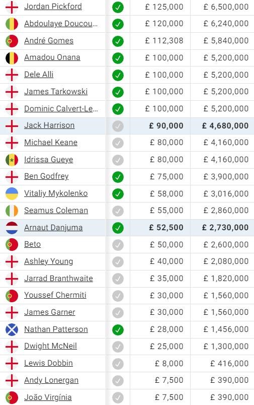 Najlepšie zarábajúcim hráčom je bez prekvapenia 29-ročný gólman Jordan Pickford, ktorý kontrakt s klubom predĺžil vo februári 2023. V tesnom závese je záložník Abdoulaye Doucoure, ktorý si zasa podmienky vylepšil v máji tohto roka.