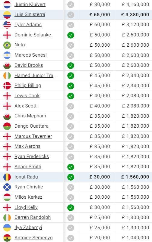 Ďalšie mená v poradí nie sú prekvapujúce - Sinnistera, Adams, Solanke, Neto, Senesi a Brooks sa držia na hranici 50-tisíc libier týždenne.