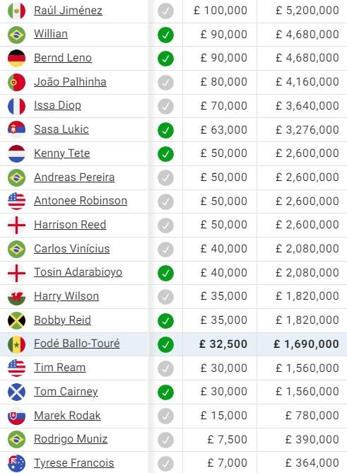 Chalupári vyplácajú najvyššie mzdy veteránom v kádri - 32-ročnému útočníkovi Jimenezovi, 35-ročnému záložníkovi Willianovi a 31-ročnému gólmanovi Lenovi. Až za nimi je Joao Palhinha, o ktorého sa v lete usiloval Bayern, aby napokon podpísal nový kontrakt na západe Londýna.