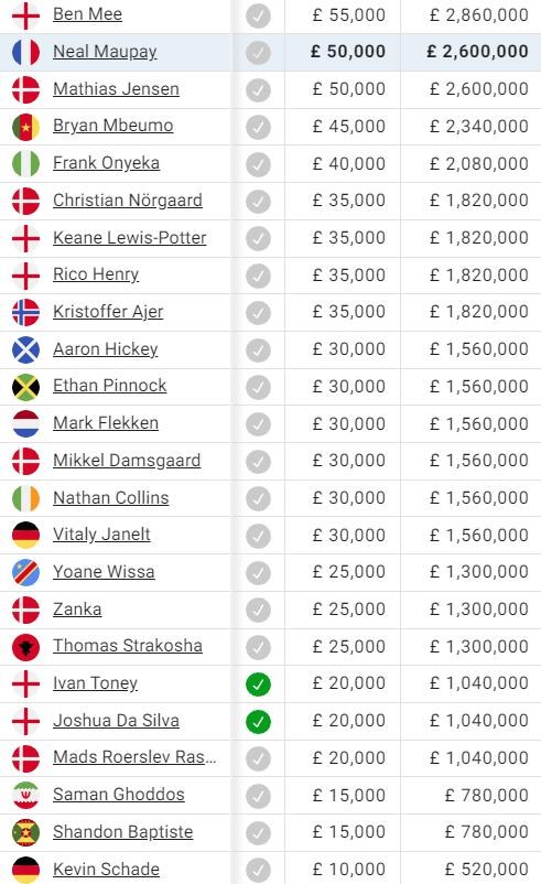 Ben Mee, Neal Maupay a Mathias Jensen sú ako najlepšie zarábajúci hráči na úrovni 50-tisíc libier. Aktuálne suspendovaný ostrostrelec Ivan Toney, ktorý do klubu prišiel v roku 2020 z Peterborough za necelých 6 miliónov eur, uzatvára prvú dvadsiatku s platom 20 tisíc libier týždenne.