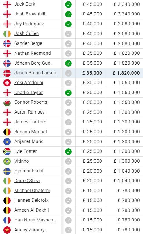 V Burnley poberajú najvyššiu mzdu anglickí hráči Jack Cork, Josh Brownhill a Jay Rodriguez (menej ako 50 tisíc libier týždenne). Dopĺňajú ich dve nové letné posily - záložníci Cullen a Berge.
