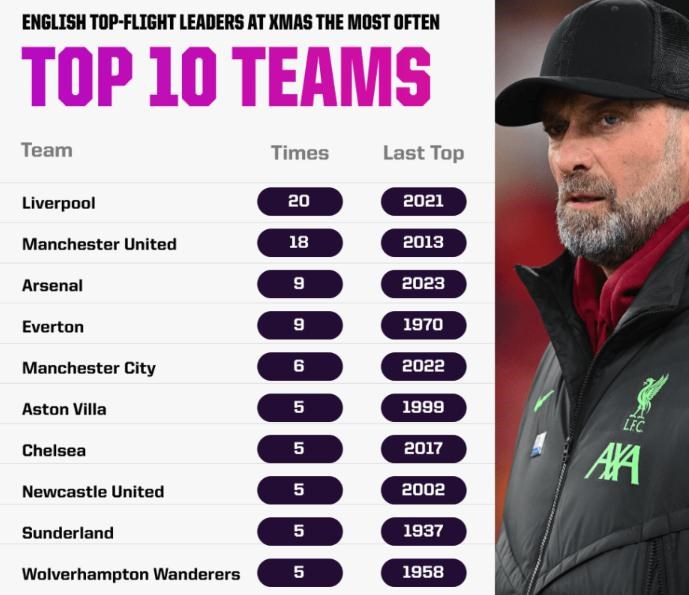 V celej histórii anglickej najvyššej súťaže bol počas Vianoc na vrchole tabuľky najčastejšie Liverpool (20), hoci ho iba tesne nasleduje Manchester United (18) - sú to jediné dva kluby, ktoré v tejto kategórii dosiahli dvojciferný počet. Evertonu sa to naposledy podarilo v roku 1969, ale tento úspech sa mu podarilo zaznamenať celkovo deväťkrát, podobne ako Arsenalu, ktorý bol naposledy na vrchole na Vianoce v minulej sezóne (2022/23).