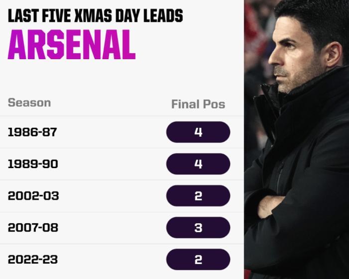 Arsenal nevyhral ligu v posledných piatich prípadoch, keď viedol tabuľku najvyššej súťaže na Vianoce. Naposledy Gunners vyhrali ligu, keď boli lídrom na Vianoce, v sezóne 1947/48.