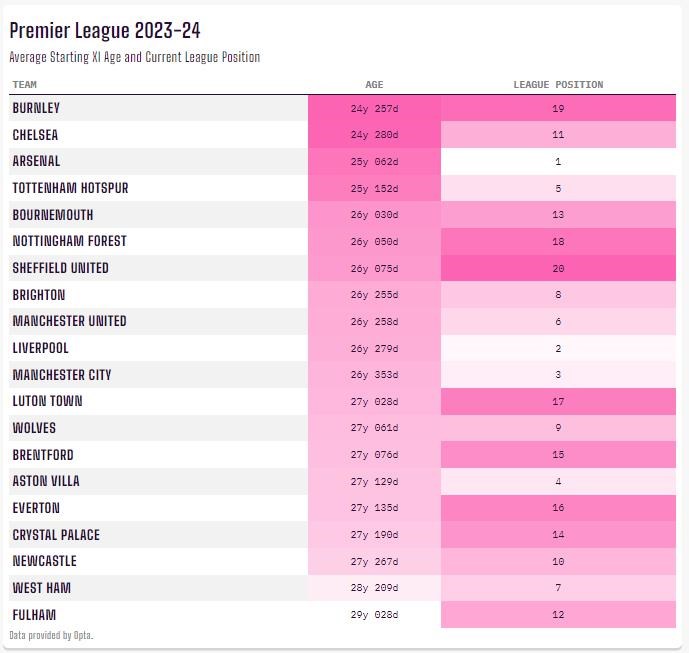 V sezóne 2023/24 je korelácia medzi vekom a umiestnením v lige menšia, ale existuje šanca, že tri kluby, ktoré zostúpia do Championship, budú patriť medzi najmladšie v súťaži. Takmer odsúdená dvojica Burnley a Sheffield United má v tejto sezóne najnižší (24 rokov, 257 dní), resp. siedmy najnižší (26 rokov, 75 dní) priemerný vek svojich základných jedenástok.