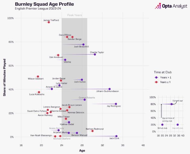 Vincent Kompany bol odvážny ako hráč a je odvážny aj ako manažér. Niekto by povedal, že až príliš odvážny, keďže (možno až príliš) dôveruje mladým hráčom. 19-roční Luca Koleosho (13) a Wilson Odobert (16) dostávajú slušnú porciu zápasov a 21-ročný gólman James Trafford (28) vynechal dokonca iba jeden duel. Nie je preto prekvapením, že priemerný vek hráčov základnej jedenástky Burnley v ich prvej sezóne po návrate do najvyššej súťaže je len 24 rokov a 257 dní.