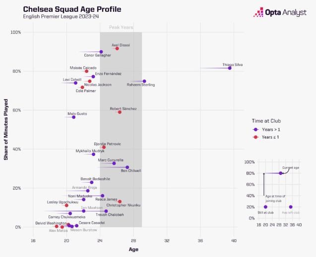 Modrí by boli na vrchole tohto rebríčka, keby nebolo 39-ročného nestarnúceho obrancu Thiaga Silvu, ktorý v tejto sezóne nastúpil v 22 z 27 zápasov Chelsea. Ako ukazuje nasledujúca grafika profilu mužstva, Silva je jediným hráčom Chelsea starším ako 30 rokov.