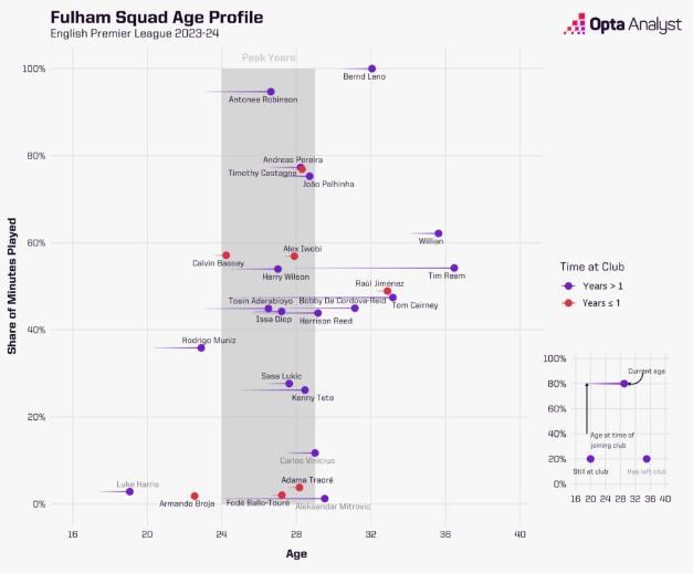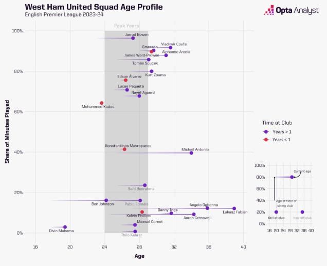 Fulham a West Ham pokračujú presne tam, kde v minulej sezóne skončili. Po tom, čo sa v sezóne 2022/23 umiestnili ako najstarší, respektíve druhý najstarší tím Premier League s jedinými štartovacími jedenástkami, ktoré mali priemerný vek vyšší ako 28 rokov, sa aj v tejto sezóne v tomto smere udržali na prvých dvoch miestach.