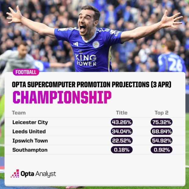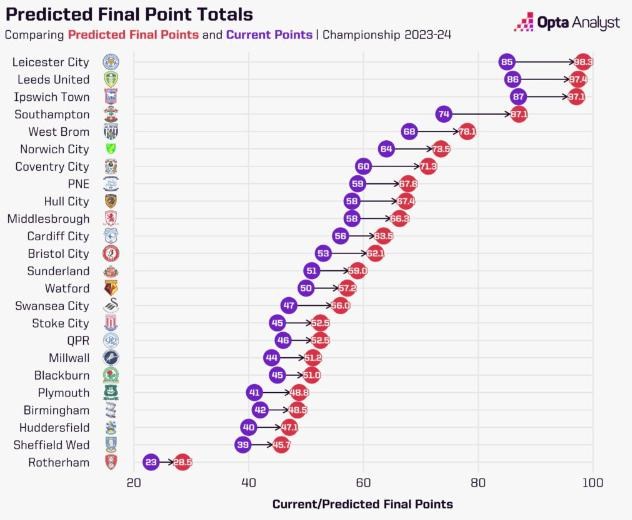 O tom, že môžeme očakávať neuveriteľne tesný súboj o prvé dve miesta zaručujúce automatický postup, svedčia aj simulácie superpočítača Opta, pri ktorých Leicester získal v priemere 98,3 bodu, Leeds 97,4 bodu a Ipswich 97,1 bodu.