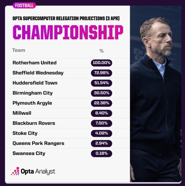 Sheffield Wednesday je v súčasnosti favoritom číslo dva, pričom Owls majú podľa portálu Opta aktuálne 72,98 % šancu na zostup o súťaž nižšie.