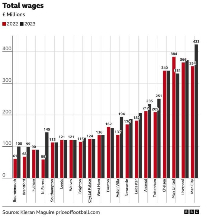Graf zobrazujúci celkové mzdové náklady jednotlivých klubov Premier League v rokoch 2022 a 2023