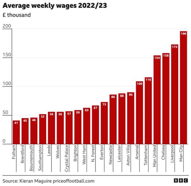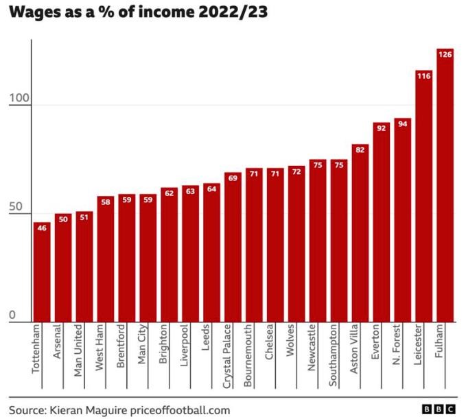 Maguire hovorí, že existuje "mimoriadne vysoká korelácia medzi mzdami a konečným umiestnením v lige", ale nasledujúci graf zároveň poukazuje na zjavné riziko - Leicester v roku 2023 zostúpil do nižšej súťaže so siedmym najvyšším účtom na mzdy.