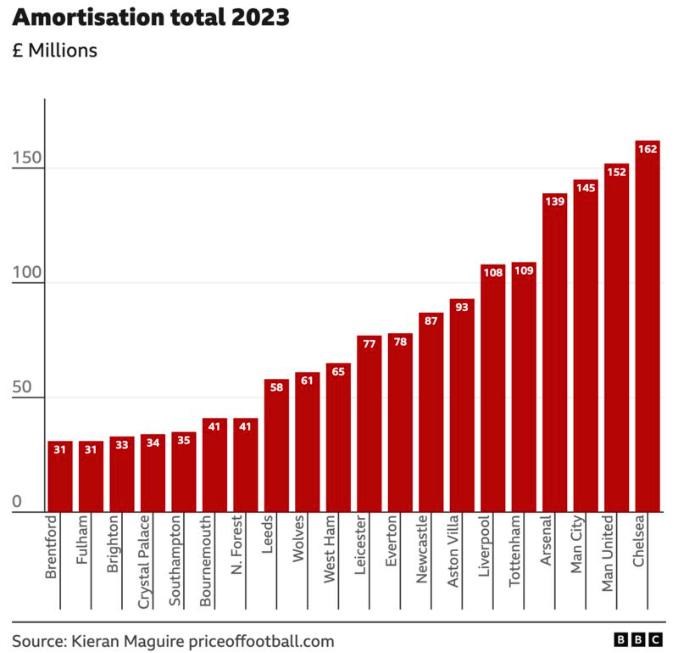 Tento graf zobrazuje celkové náklady na amortizáciu za finančný rok a vzťahuje sa na všetkých hráčov v mužstve, ktorí boli podpísaní za prestupové poplatky. Započítavajú sa ako náklady v účtoch zisku a udržateľnosti (PSR) Premier League.