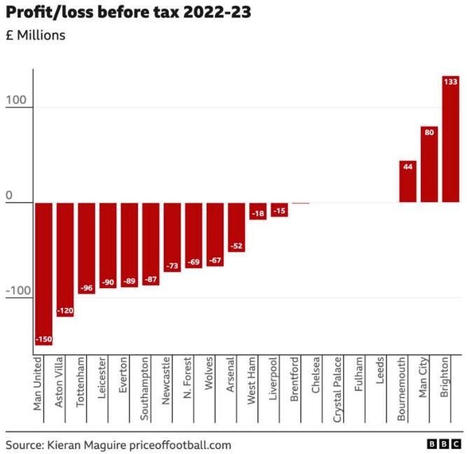 V tomto grafe dosiahol zisk z každodenného obchodovania iba Brentford (4 milióny libier) a celkové straty 20 klubov Premier League boli približne 1 miliarda libier - dokonca aj bez účtovných závierok Chelsea, Crystal Palace, Leedsu a Fulhamu, ktoré v roku 2023 míňali veľké sumy.