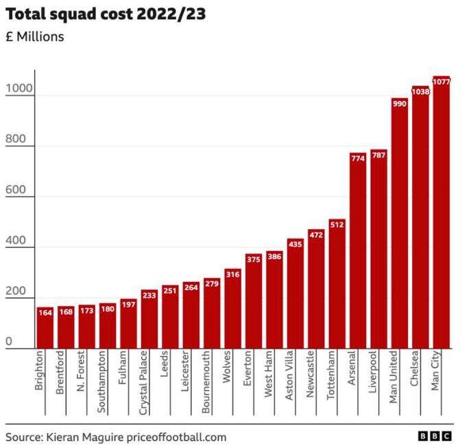 Celkové náklady na mužstvo v čase, keď jednotlivé kluby Premier League predložili svoje účty - väčšina z nich je z roku 2023. V prípade Chelsea je to od roku 2022.