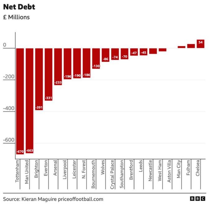 V prípade Chelsea ide o údaj z roku 2022, keď konzorcium Todda Boehlyho kúpilo klub od Romana Abramoviča za 4,25 miliardy libier. Abramovič totiž nežiadal, aby sa jeho pôžička vo výške 1,5 miliardy libier pre Chelsea splatila.