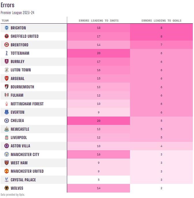 Po chybách inkasovali šesť gólov, čo je približne rovnako ako ich xG. Zatiaľ čo osem gólov Sheffieldu United padlo len z 2,7 xG (rozdiel 5,3) a osem gólov Brightonu padlo z 3,7 xG (rozdiel 4,3).